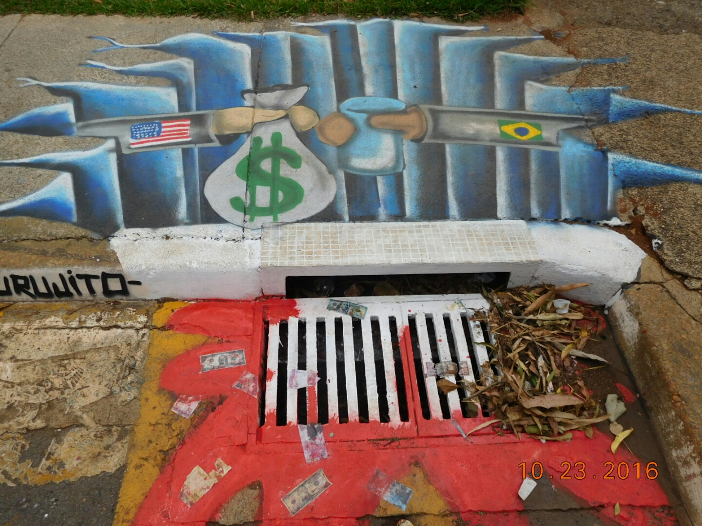 This red, white and blue sidewalk painting shows the arm of the USA offering a bag of money to Brasil who in turn offers a barrel of oil. These images overlay the great waterfalls of Brasil which turns to blood red as it flows into a sewer drain. Copies of dollars and Brasilian raeyes are glued to surface, pouring with the blood into the drain.