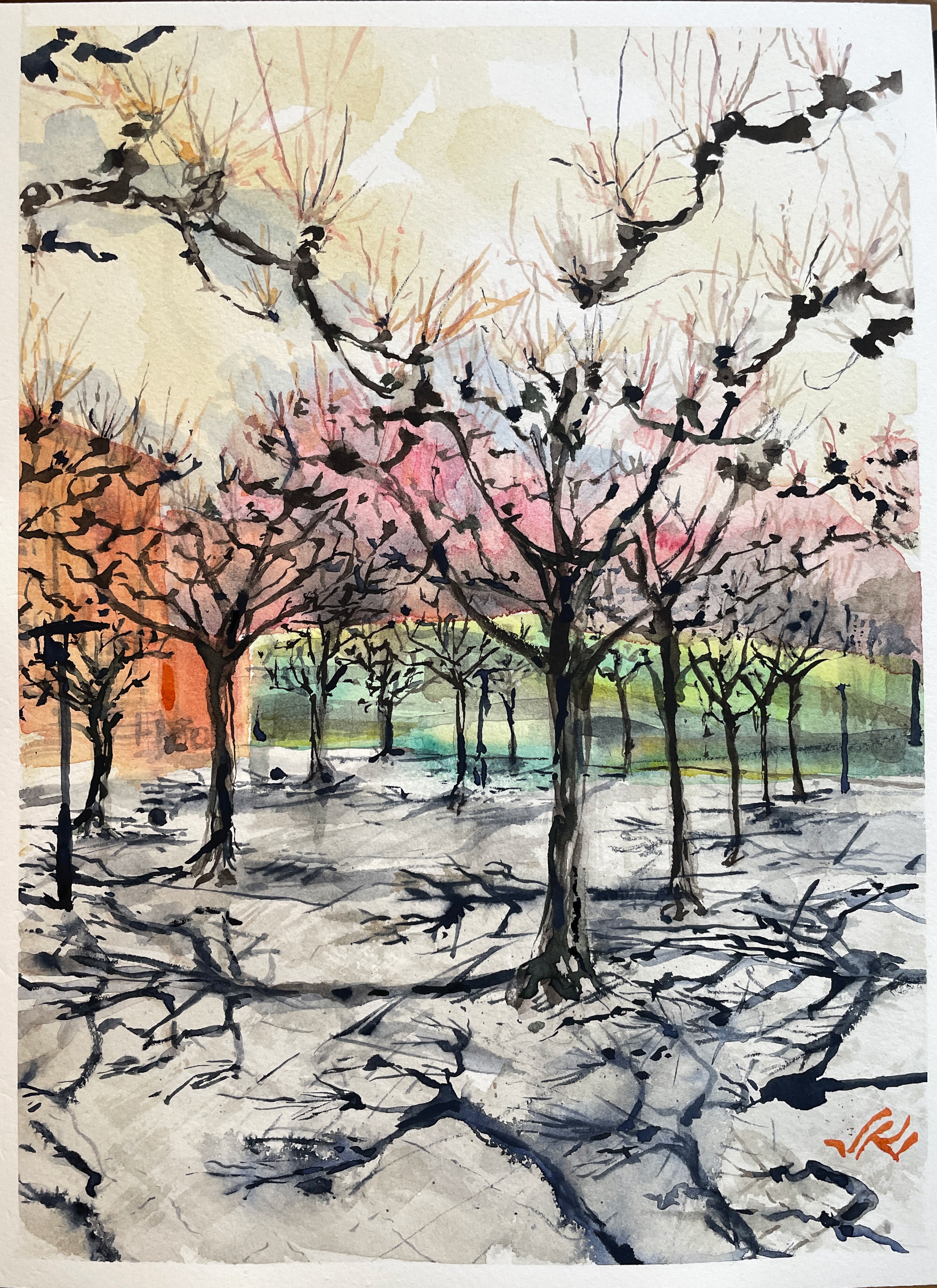 Pollards in Sweden, watercolor, 9×12″, 2023. Copyrighted with all rights reserved by Jean Krueger