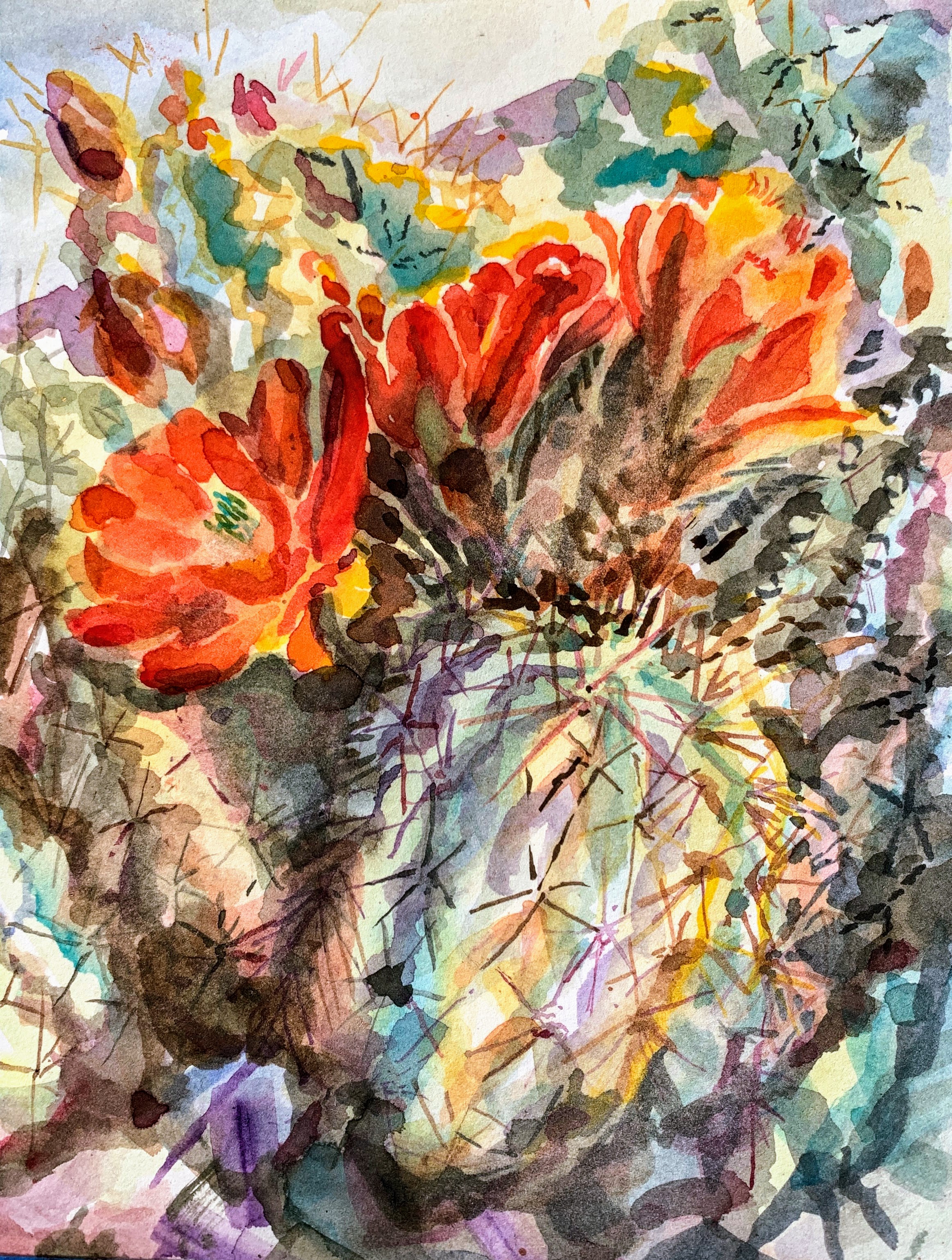 I’m trying a small Qor brand travel set of paints, 12 different pigments in a small metal case. The colors are really saturated and spring to life when water is applied to them, they have tremendous flow. This was painted at the Phoenix Desert Botanical Garden en plein air.