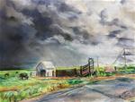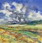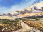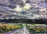 This landscape is painted of a view found in a small Colorado town. The clouds are blown in a line, a towering front, from the west over the Sangre de Cristo Mountains. A show of vaporous forms reflect the last rays at the end of day, mixing, swirling a morass of color overhead until, at last, darkness falls.