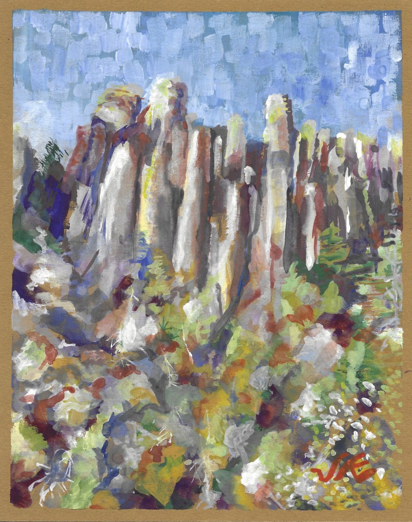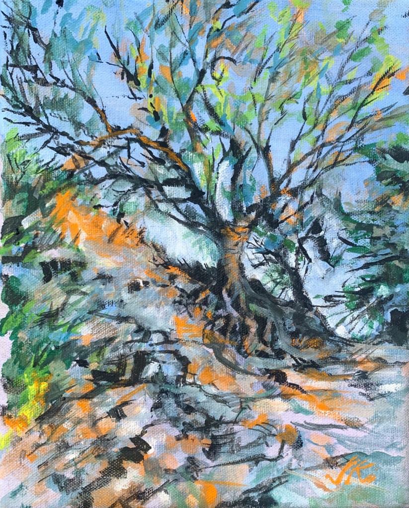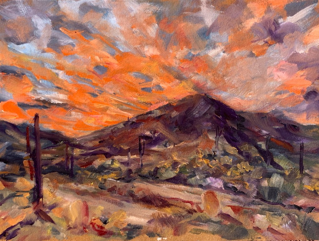Winter is nearly over in the Arizona desert. The grass is still green and the cacti look plump and perky. Not much is in bloom, the air smells moist at the end of day. As I painted, I wished the day would last a little longer, sitting there with bird calls and yipping coyotes in the earthy darkness.