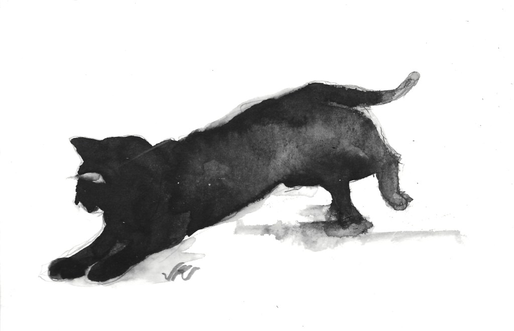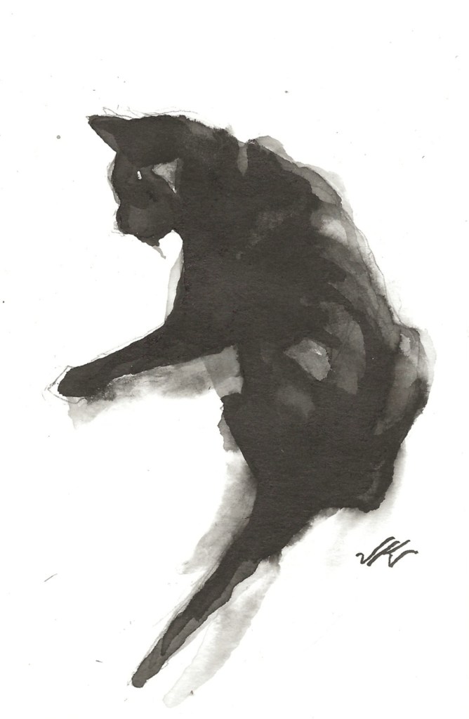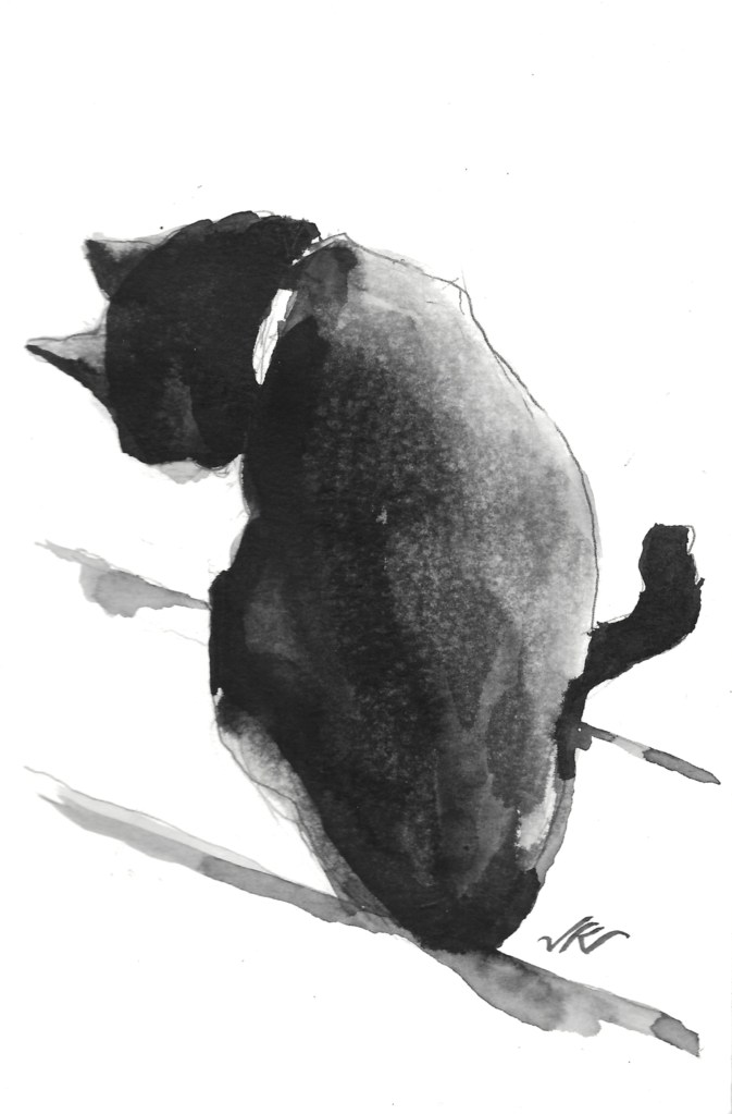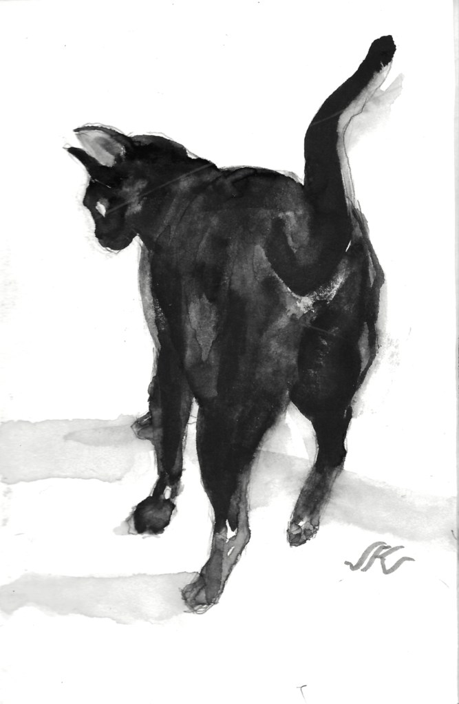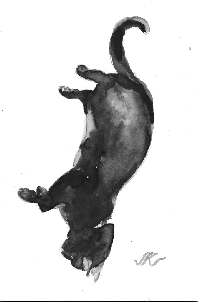In winter, a sunny slep renders a high contrast cat. I like the way the ink fades in this painting.