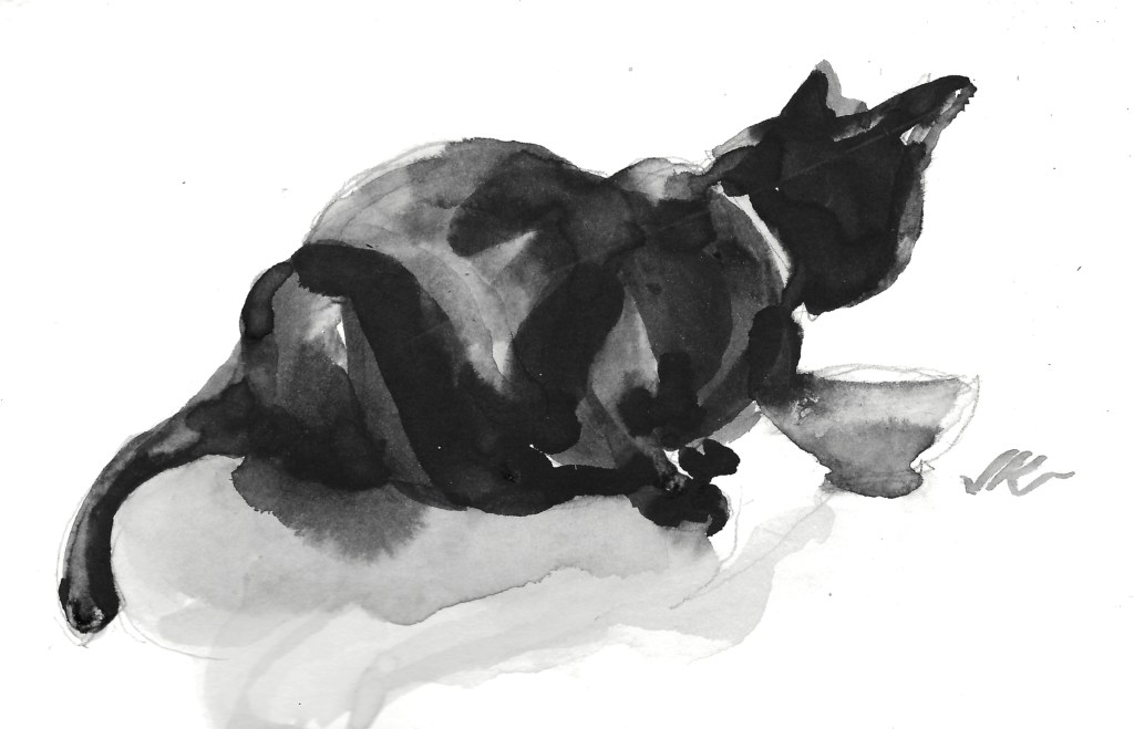 I’m using a Chinese solid ink with a caligraphy brush instead of the liquid Higgins ink I’ve been usung for months. The solid ink has a different consistancy and is easier to direct with water, I can control the contrast a lot better with it. Meow.