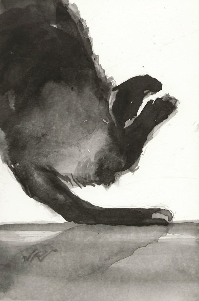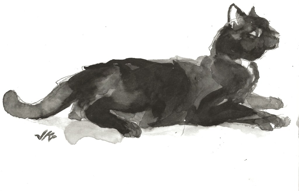Cat Back in the early morning sun. Painted with India ink, not the Chinese ink block used for the past dozen or so Daily Cats. The liquid ink flows differently. I also added watercolor medium to the paint water, making it more viscous.
