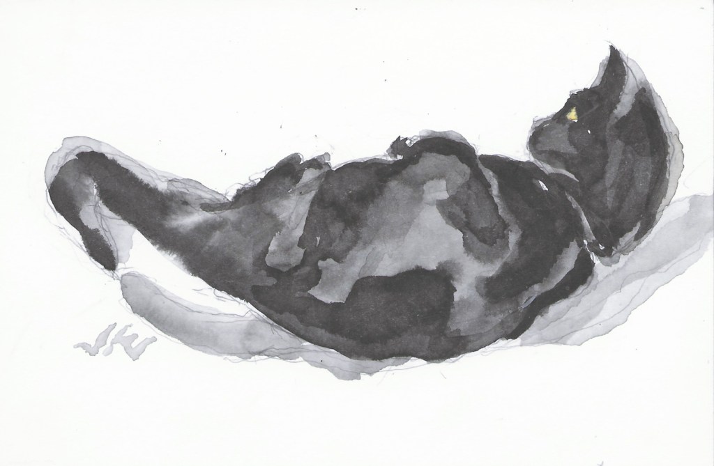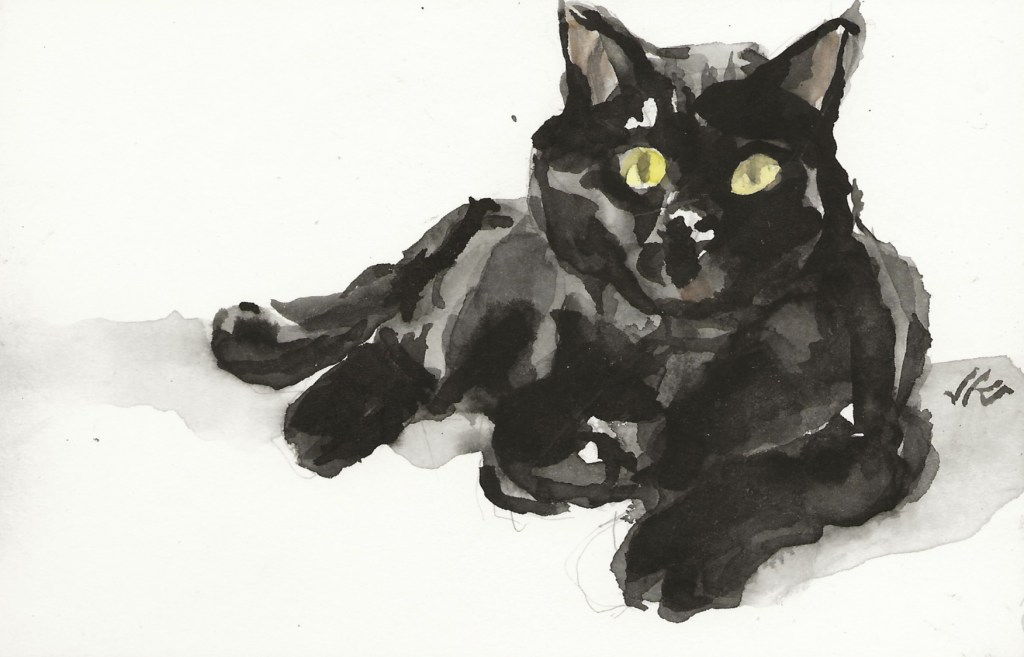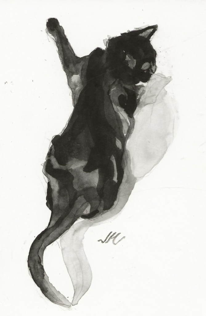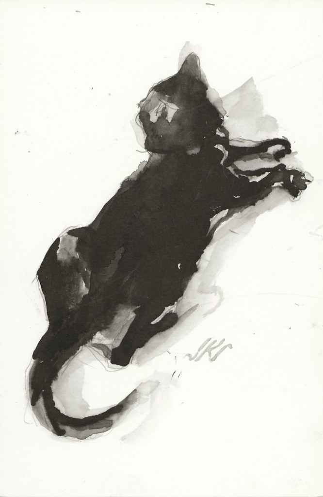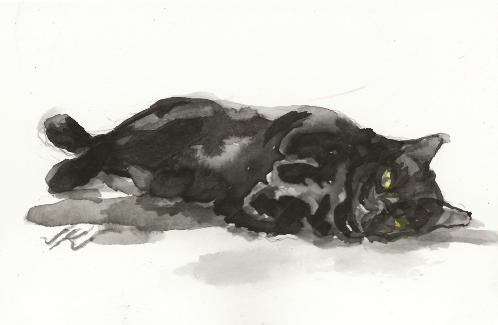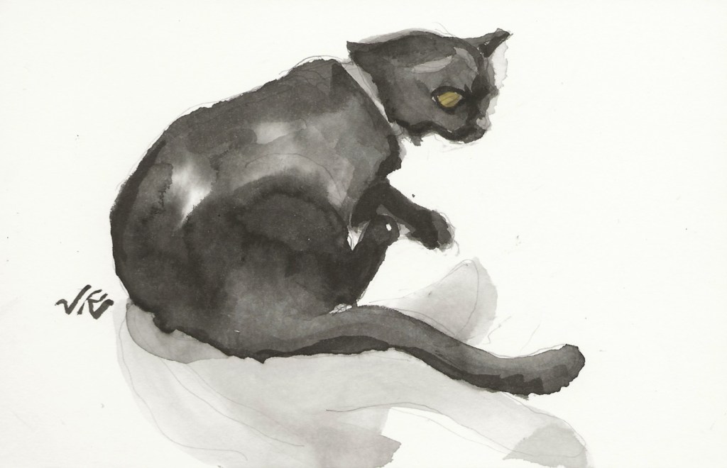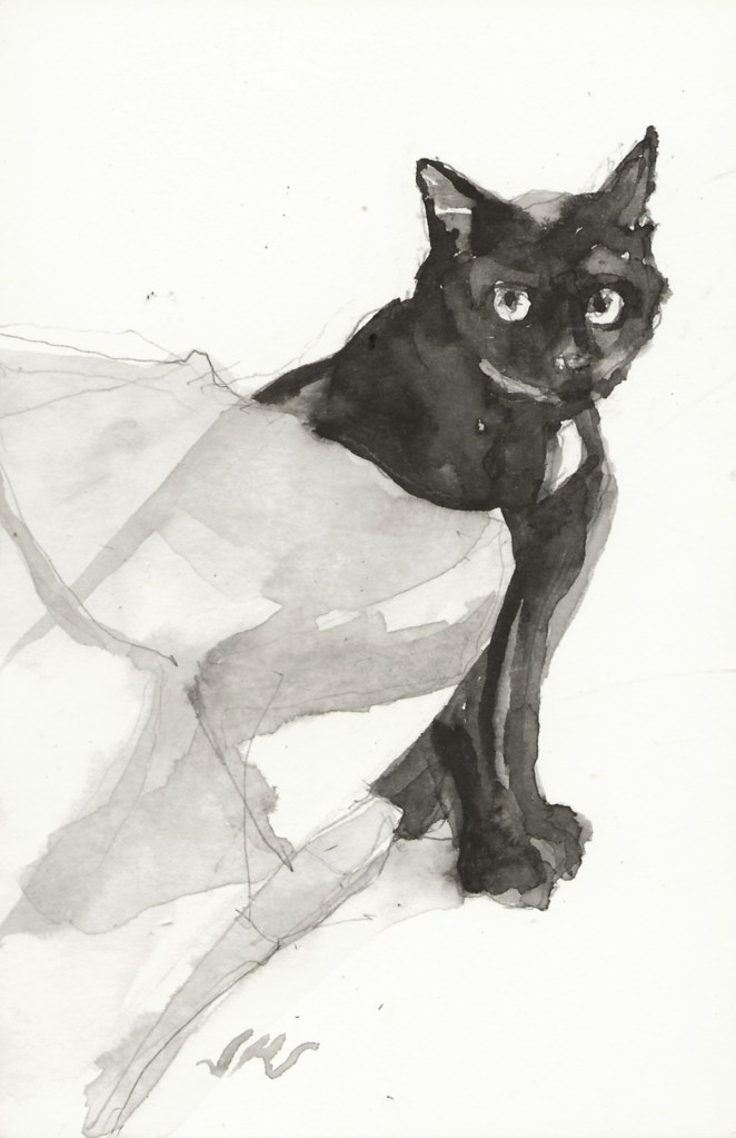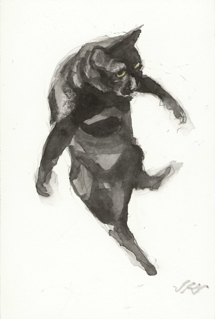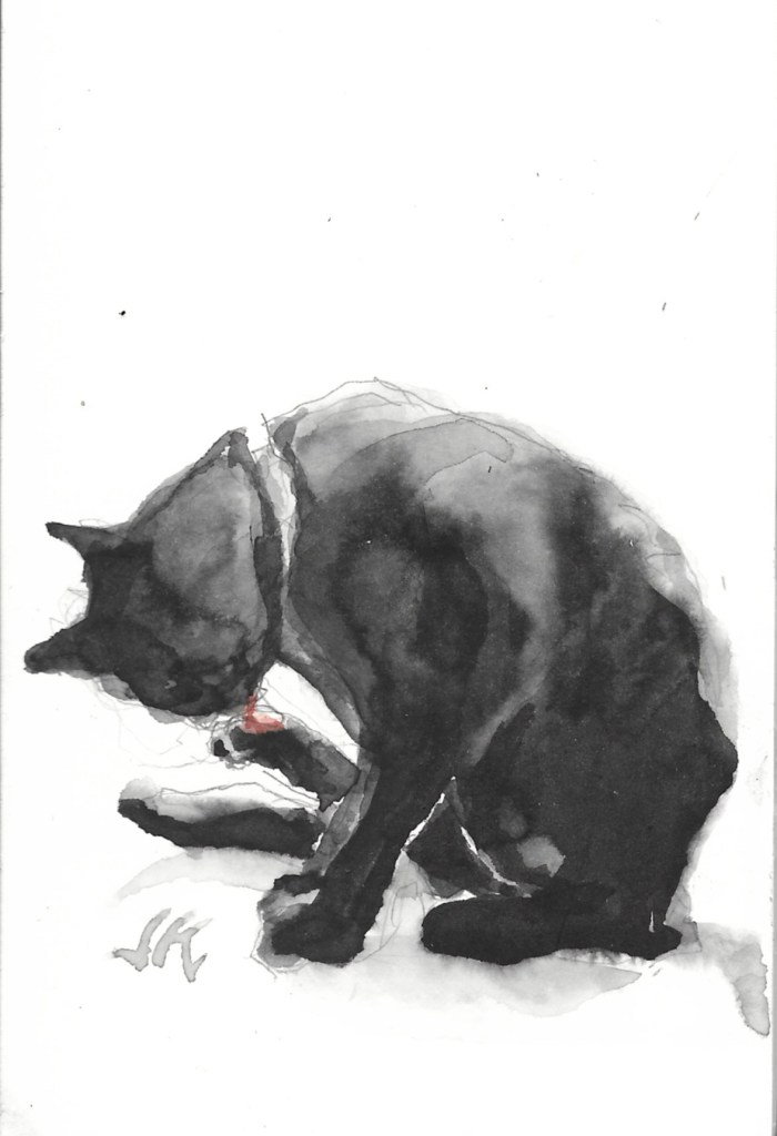 Daily Cat 187, $30 USD, brush and ink, 6×4″, 2020