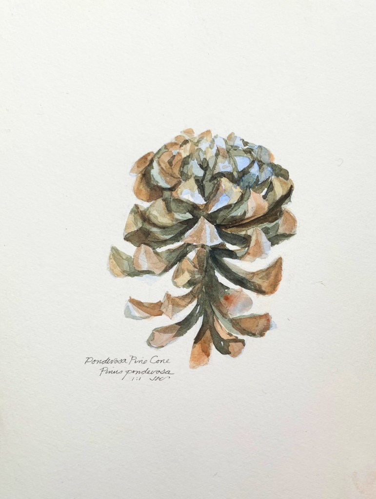 This cone is a lot larger and harder that most of the ponderosa cones I’ve painted. We found it in Southern California. I wonder if I identified it correctly although in searching for visual info on it, it most likely resembles the ponderosas. I may have to re-title it someday if I find it’s a different species.