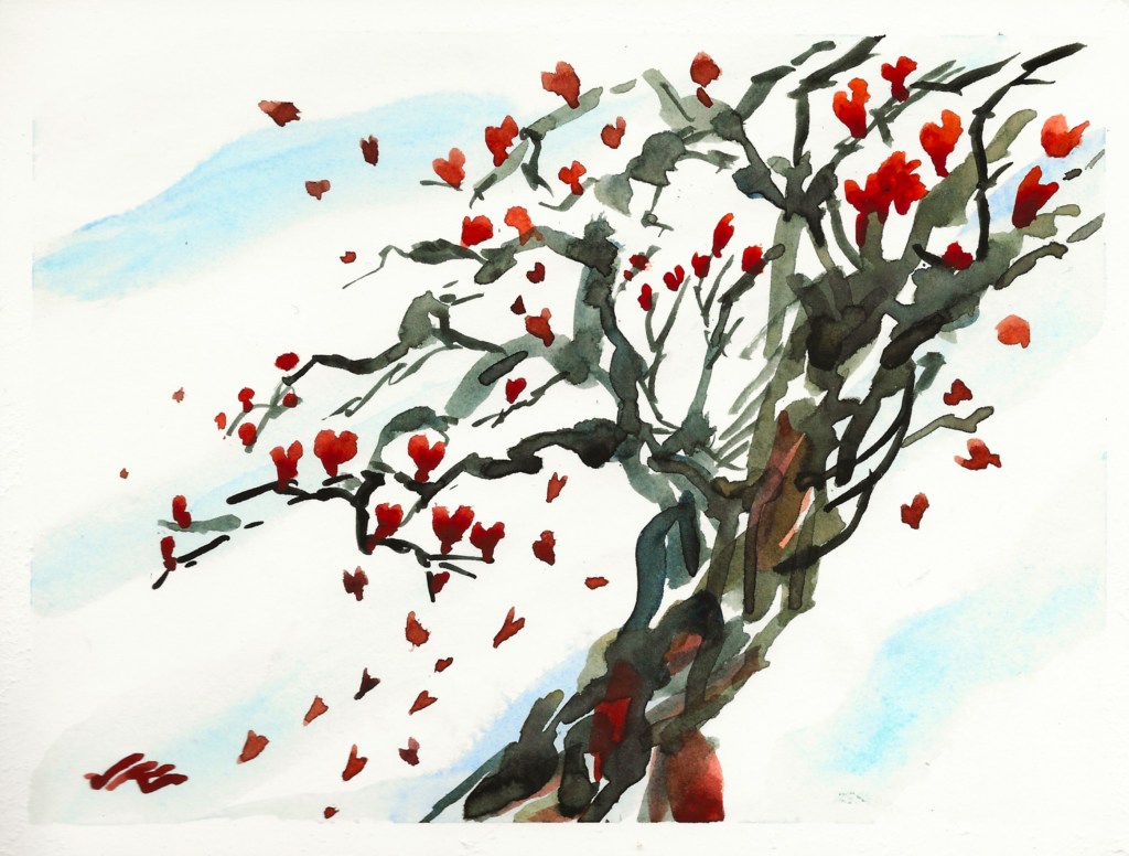 Winter rolls in. Hearts roost in leafless trees in the late-light early morning, winds 15-17mph out of the northeast. Hardship forms a bond.